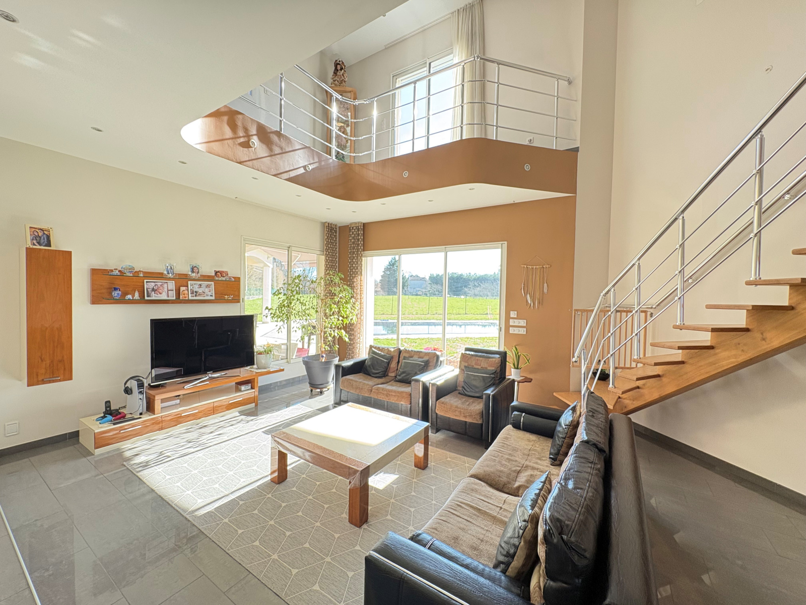 À l’étage, la mezzanine avec balcon accueille un espace bureau supplémentaire (idéal pour du télétravail) et une 4ème chambre avec salle d’eau privative.