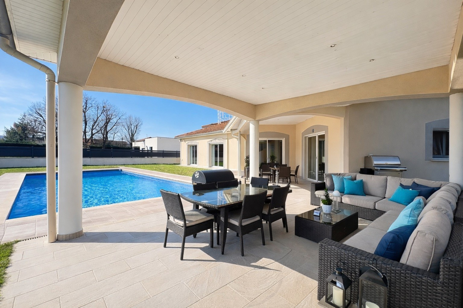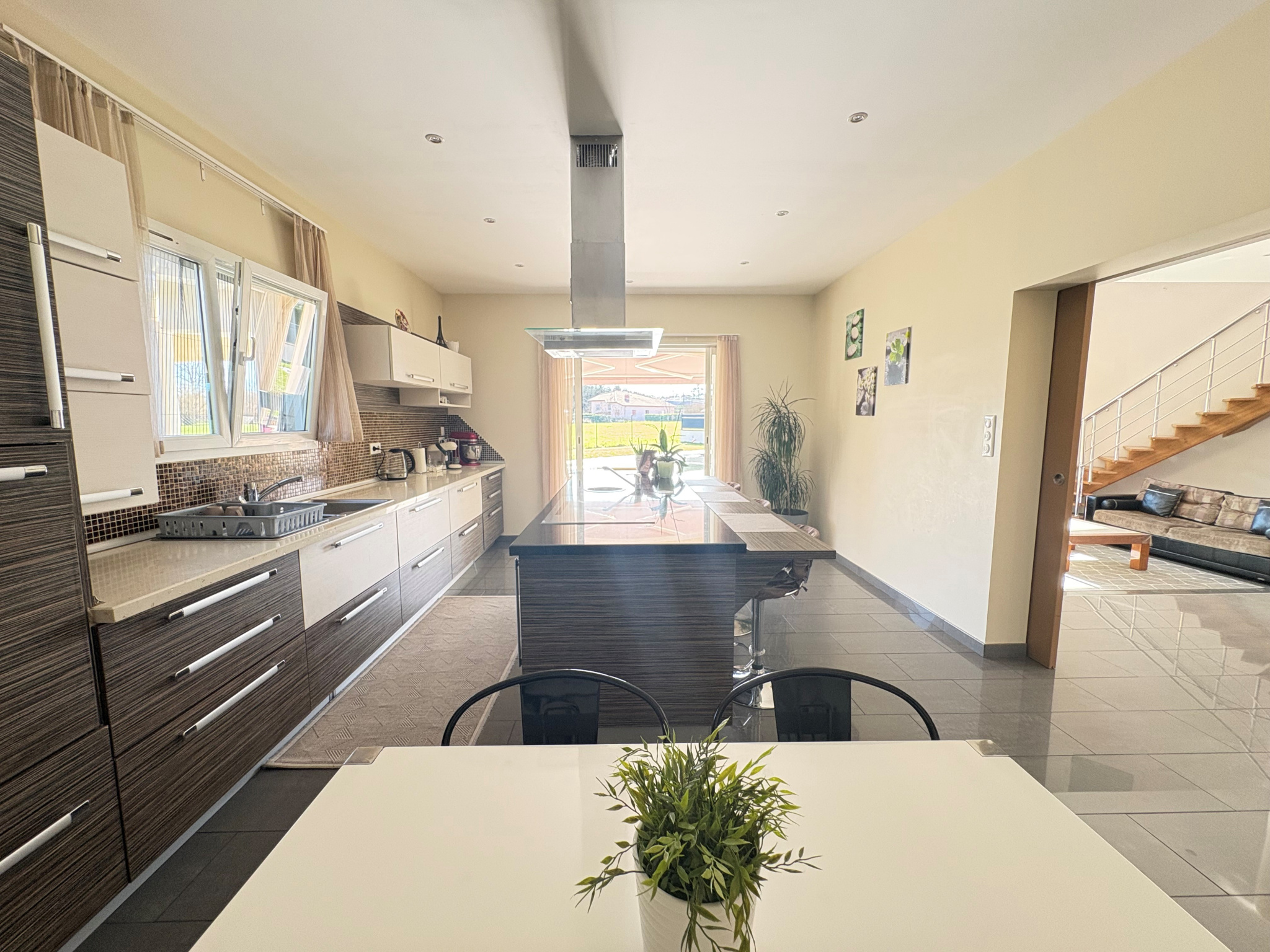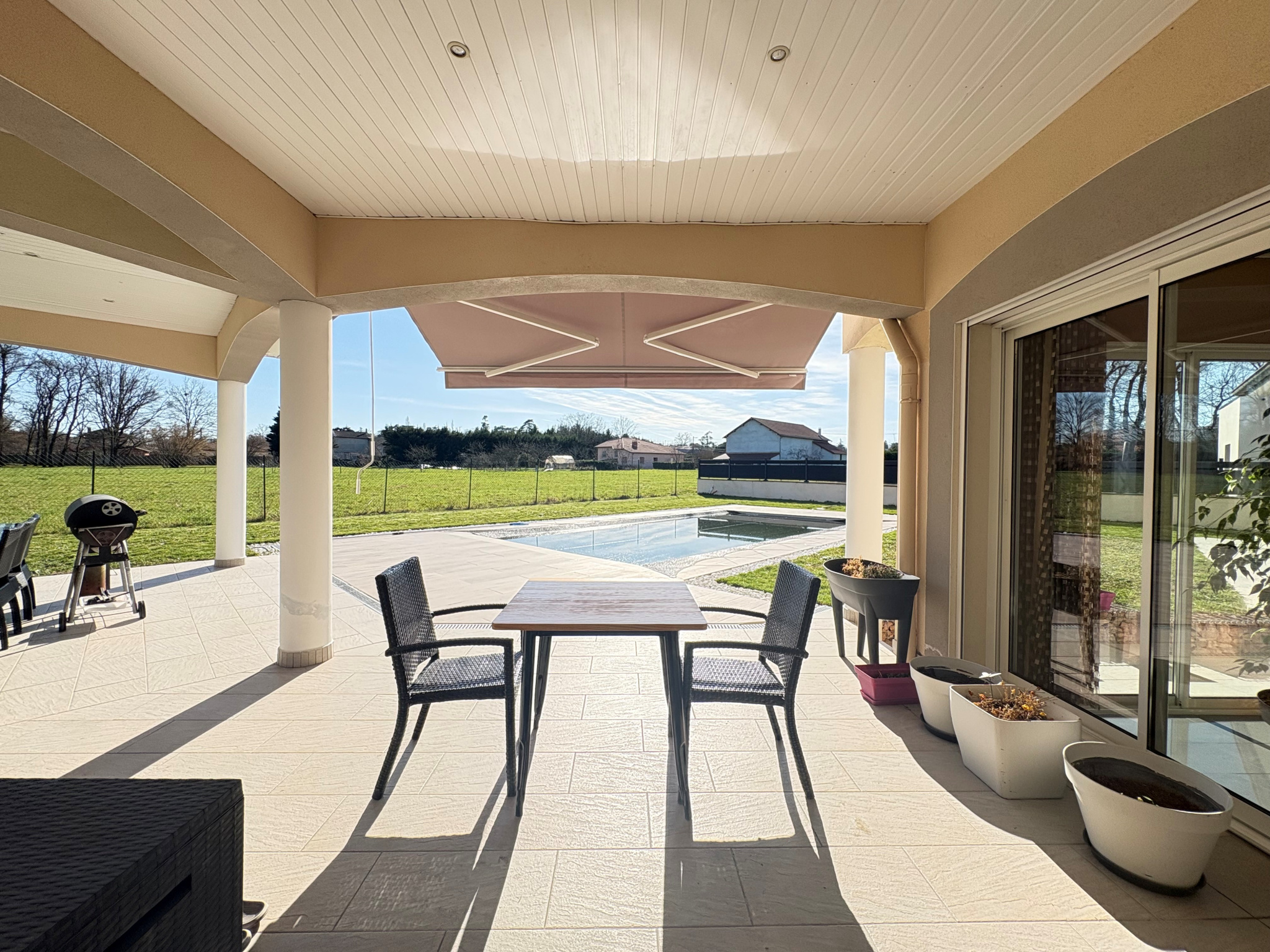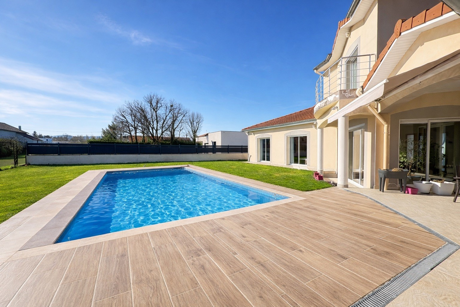 Le tout est édifié sur un terrain paysagé de plus de 1100 m², agrémenté d’une piscine récente, offrant un véritable havre de paix, ainsi que 2 belles terrasses couvertes.