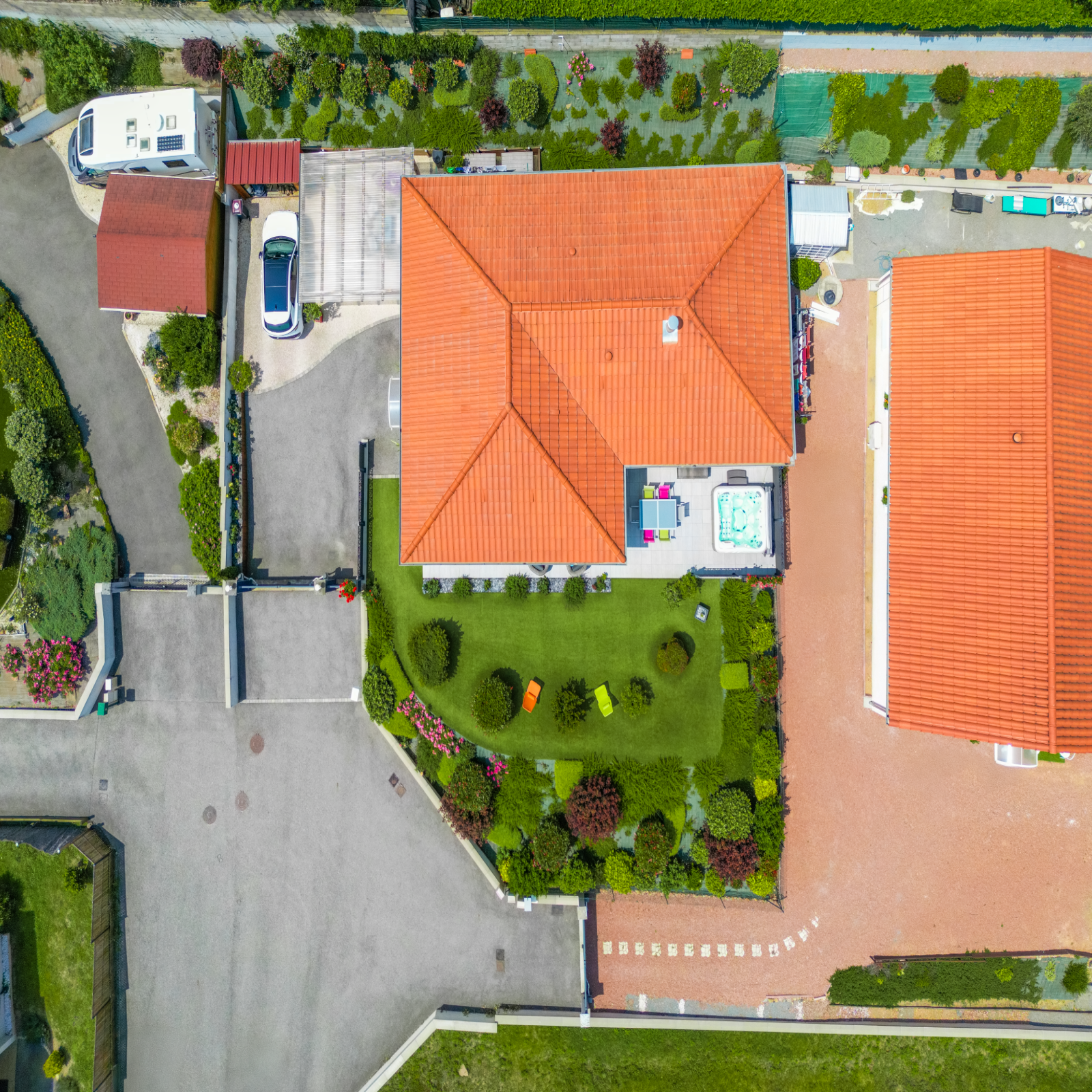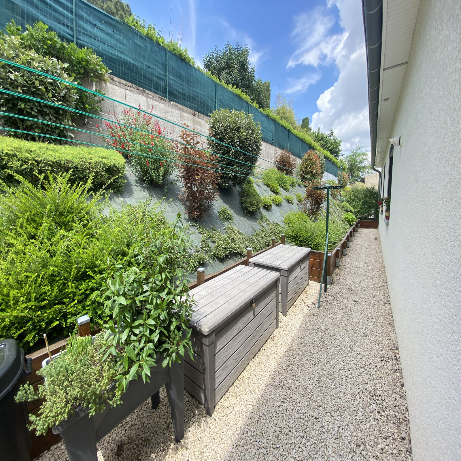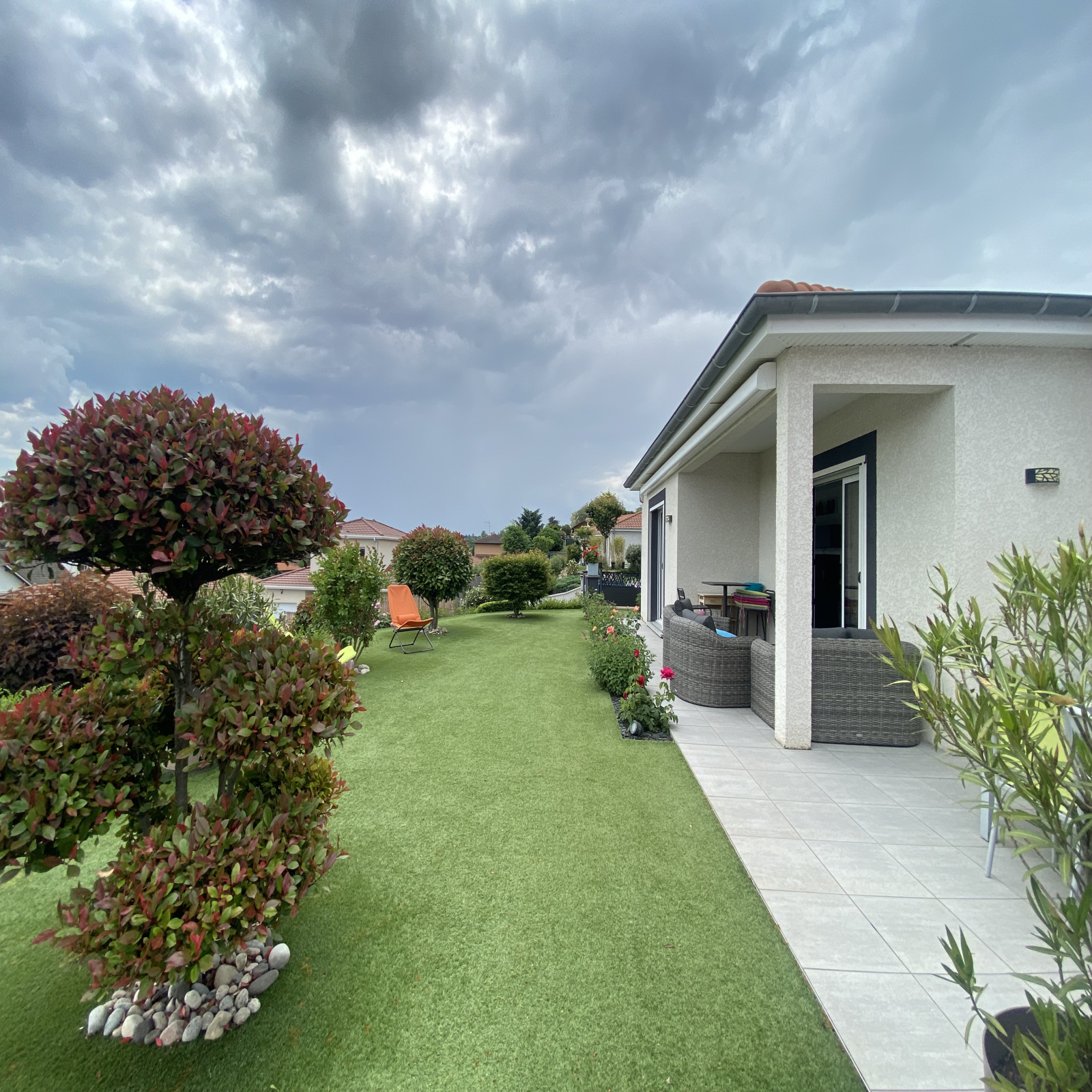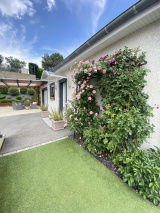 Agréable terrain de 634m² clos et paysagé avec de belles essences et sa pelouse synthétique nécessitant peu d'entretien, terrasse avec spa, cour en enrobée et gravillonnée, abri bois...