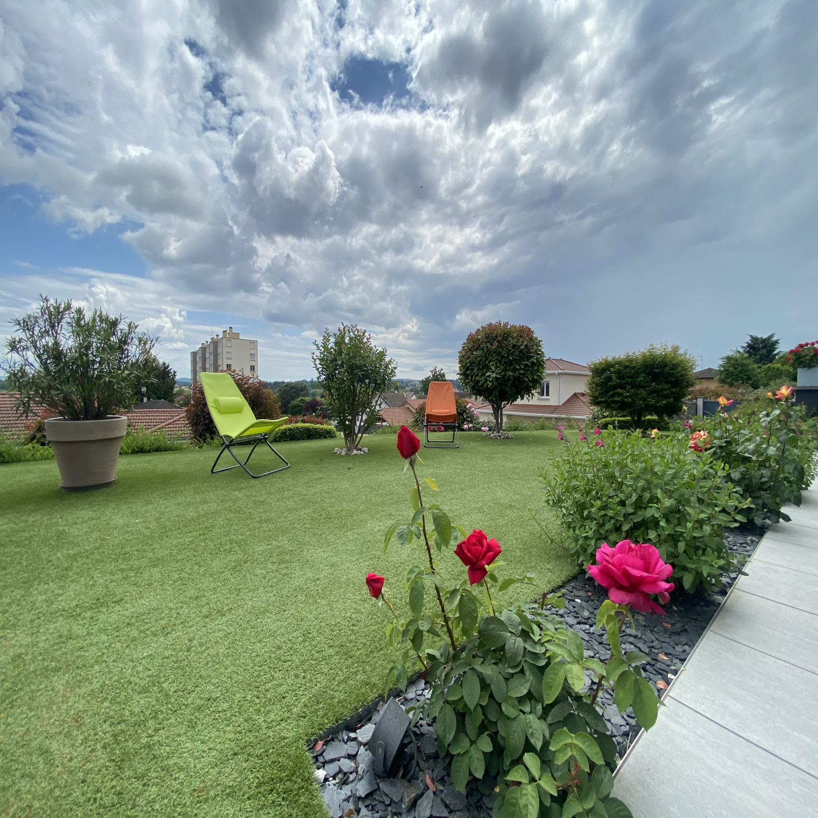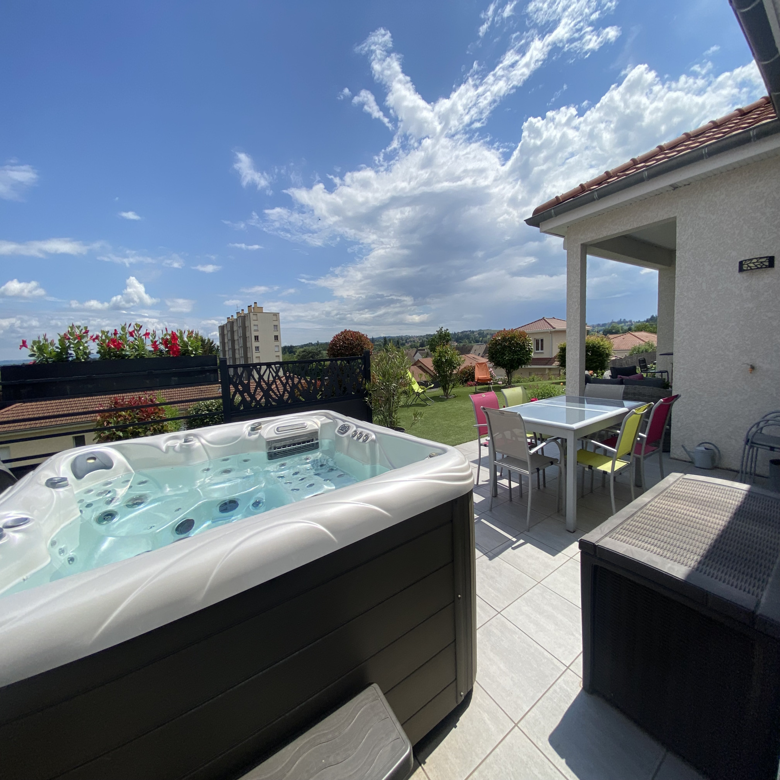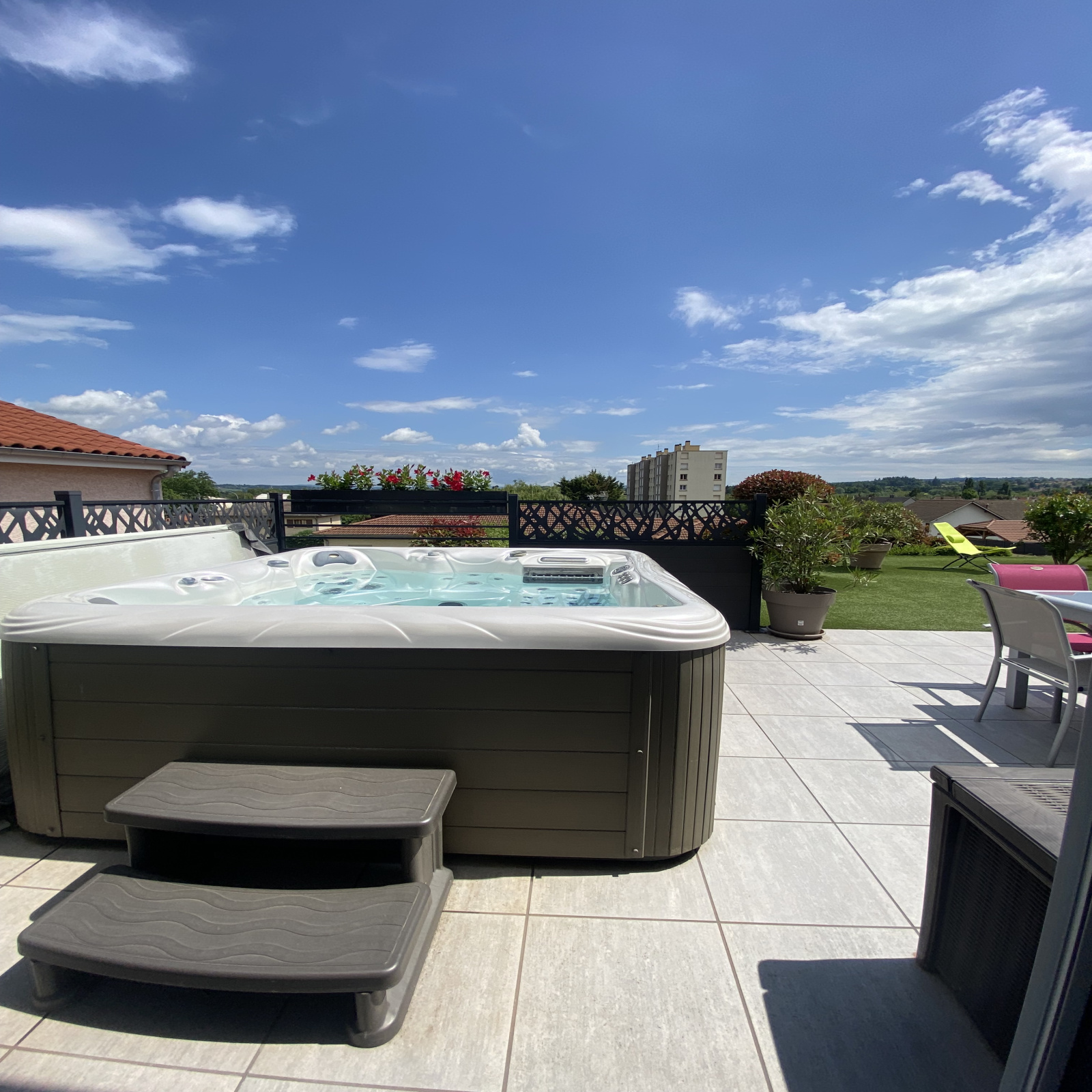 Agréable terrain de 634m² clos et paysagé avec de belles essences et sa pelouse synthétique nécessitant peu d'entretien, terrasse avec spa, cour en enrobée et gravillonnée, abri bois...