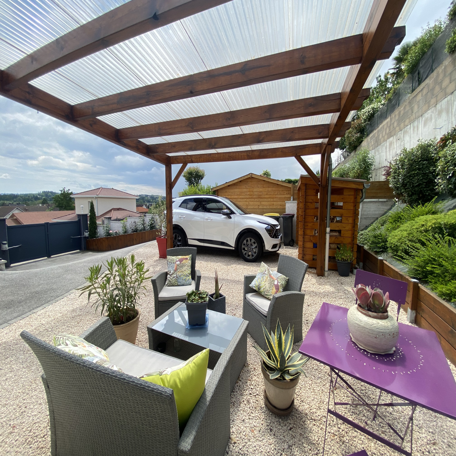 Garage carrelé et isolé de 18.62m² avec porte automatique + son carport.