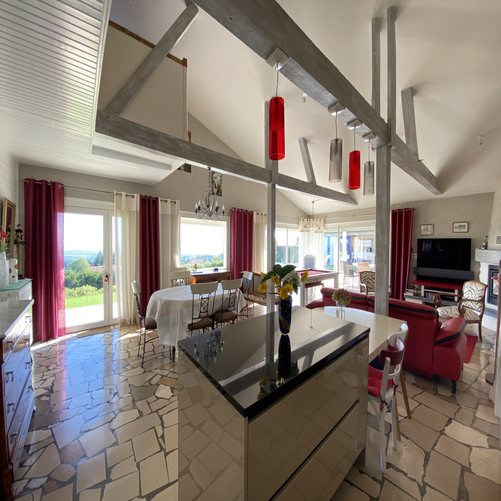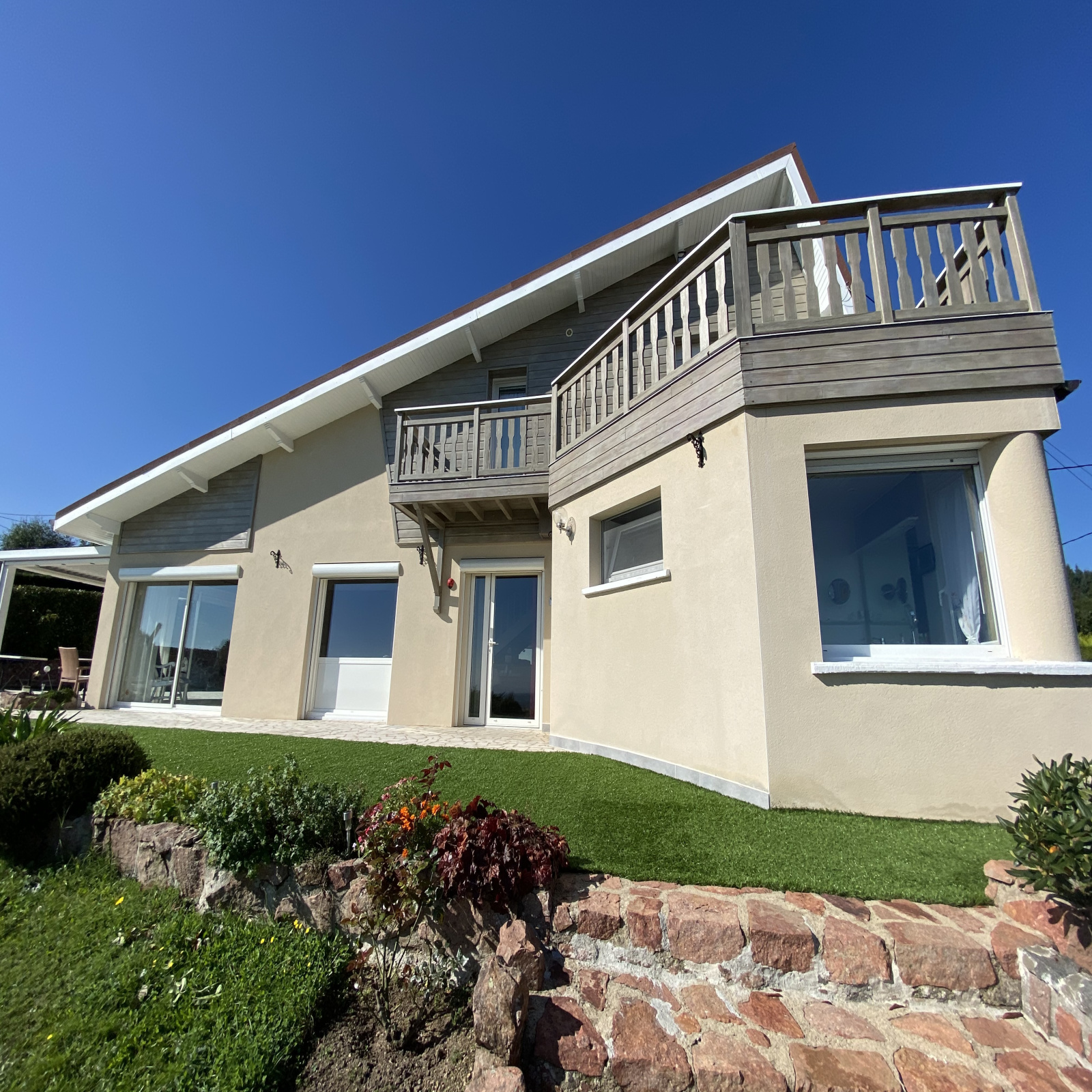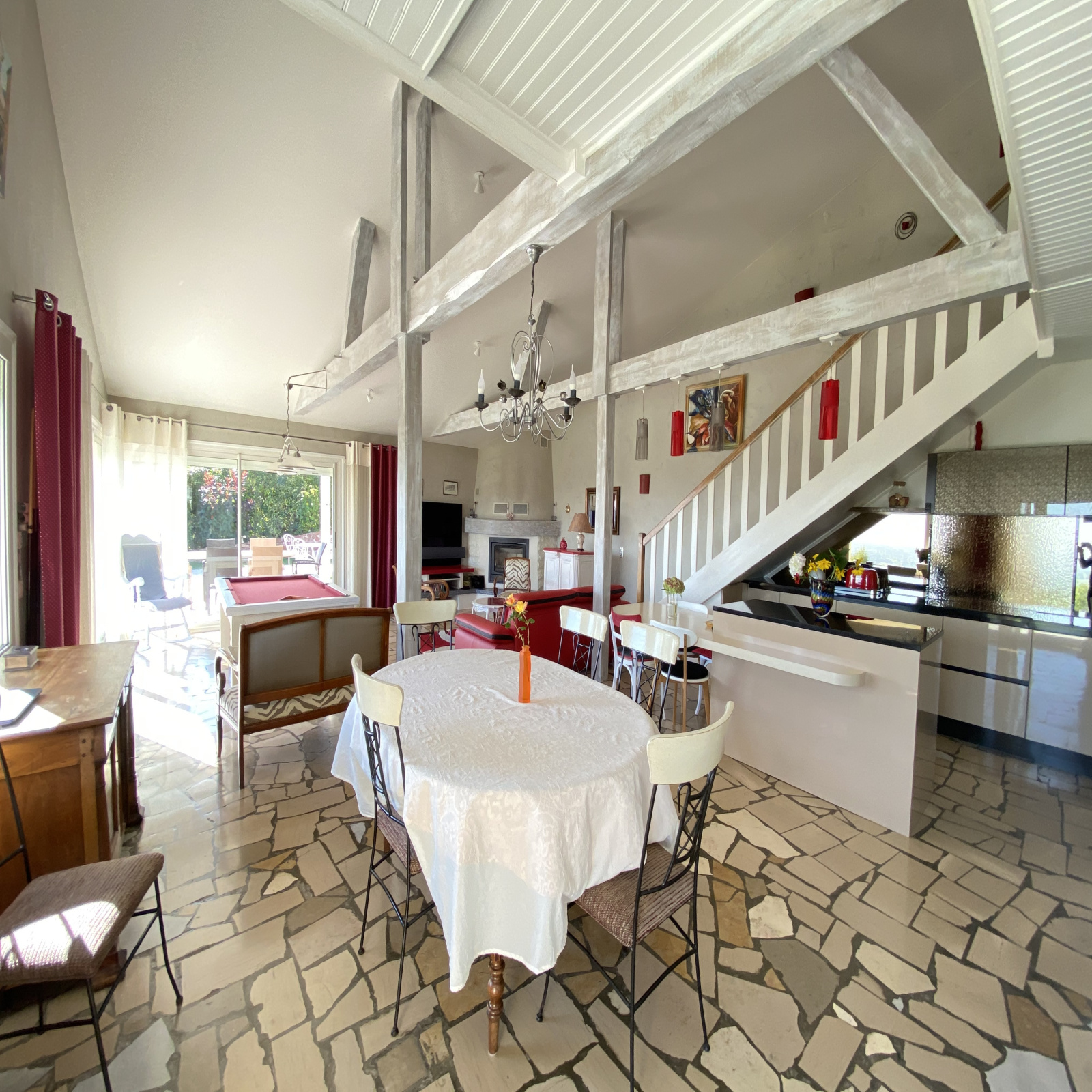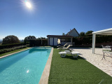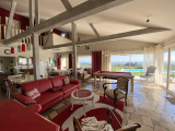 Elle offre une surface habitable d'environ 185m² et se compose d'une belle pièce de vie baignée de lumière grâce à ses baies vitrées, chaleureuse avec sa charpente apparente et sa cheminée et une cuisine moderne et équipée tout confort. Les baies vitrées s'ouvrent sur une belle terrasse avec une pergola bioclimatique lui apportant une touche de modernité